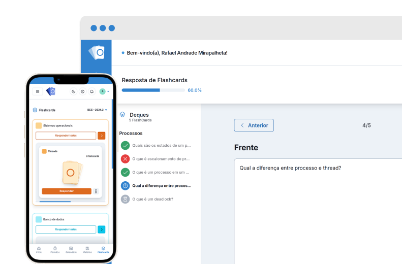 Crie períodos, defina seu plano de estudos e organize suas matérias. Agende revisões espaçadas, crie flashcards personalizados, faça anotações e registre provas e trabalhos. Acompanhe seu progresso e estude de forma prática e eficiente.