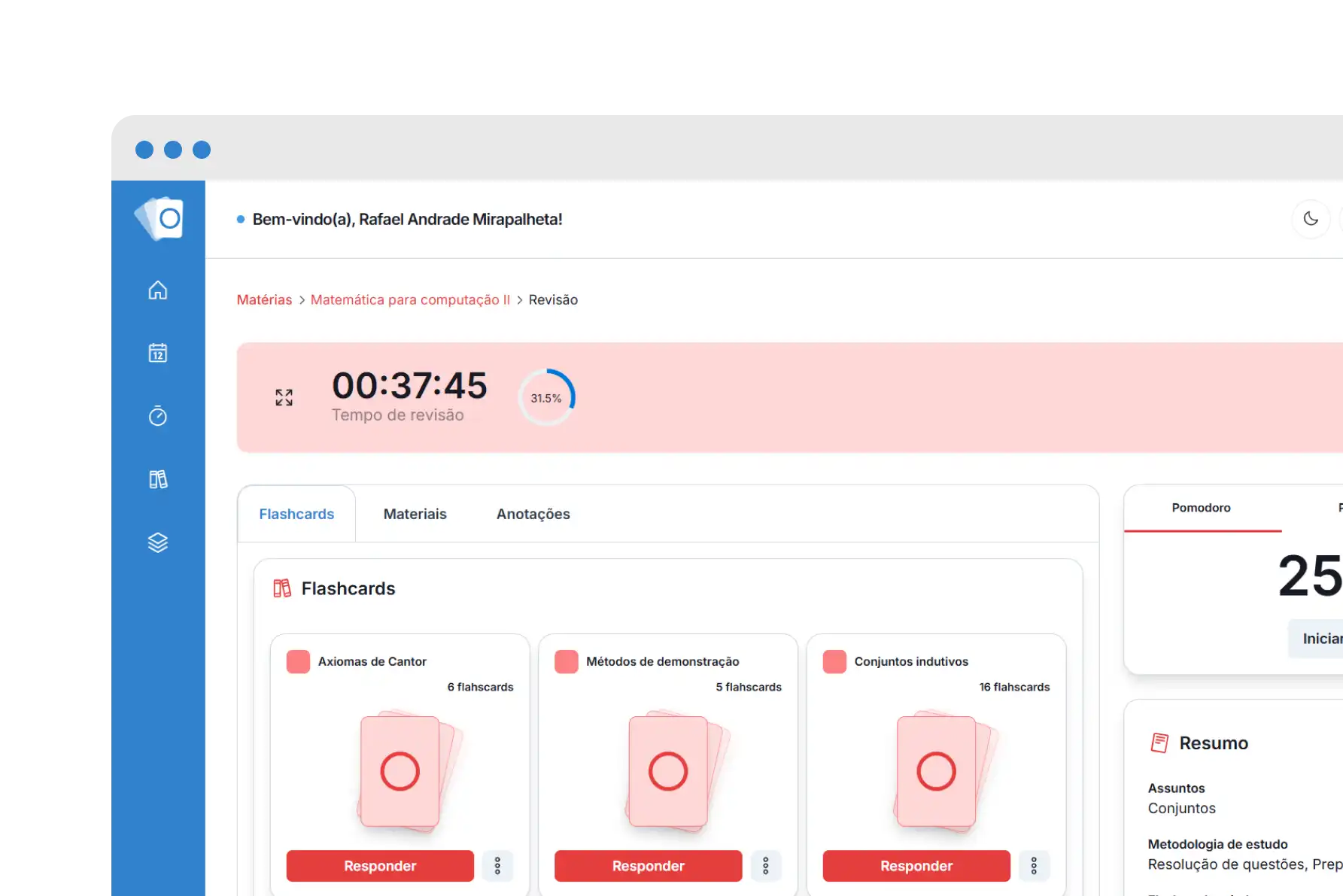 Como concurseiro, a organização era um dos meus maiores desafios. O Organizza me ajudou a planejar minhas matérias, agendar revisões e até criar simulados com os flashcards. A IA realmente facilitou muito o processo.